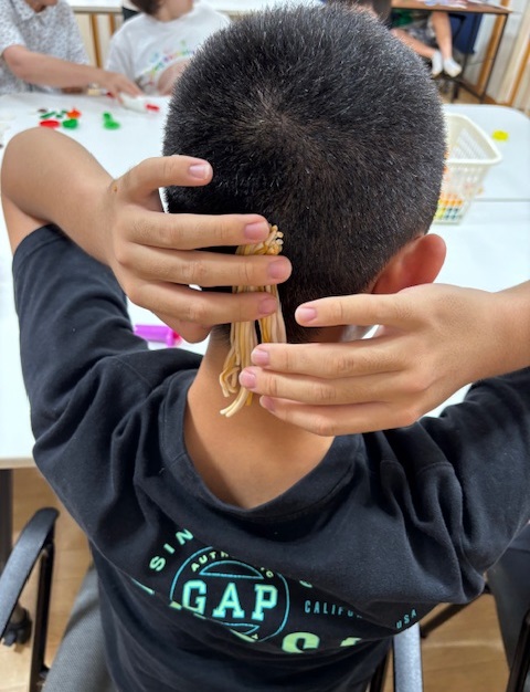 細長くした粘土を頭につけて
